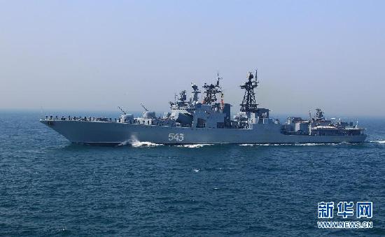 4月26日,俄罗斯海军“特里布茨海军上将”号大型反潜舰接受检阅。当日,参加“海上联合-2012”中俄海上联合军事演习的双方舰艇、飞机在青岛附近黄海海域举行盛大的海上阅兵仪式。这次海上阅兵主要包括舰艇19艘、飞机19架,采取海上分列式的方式依次通过阅兵舰接受检阅。海上阅兵是“海上联合-2012”中俄海上联合军事演习的第三阶段。此前,中俄双方已经进行了作战筹划、实兵演习等课目的演练。