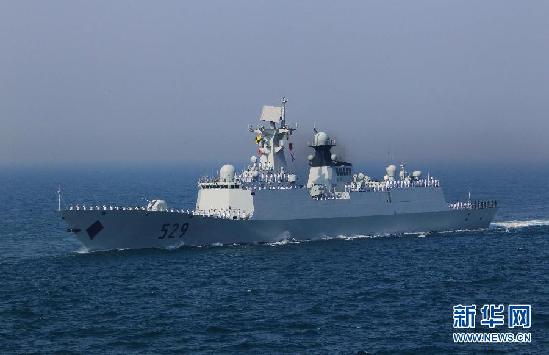 4月26日,中国海军“舟山”号导弹护卫舰接受检阅。当日,参加“海上联合-2012”中俄海上联合军事演习的双方舰艇、飞机在青岛附近黄海海域举行盛大的海上阅兵仪式。这次海上阅兵主要包括舰艇19艘、飞机19架,采取海上分列式的方式依次通过阅兵舰接受检阅。海上阅兵是“海上联合-2012”中俄海上联合军事演习的第三阶段。此前,中俄双方已经进行了作战筹划、实兵演习等课目的演练。(记者 查春明