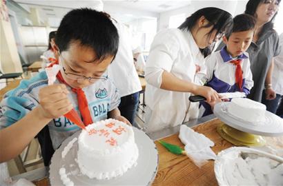 一进糕点制作间,孩子们就迫不及待地自己动手开始蛋糕的制作与装饰,当他们把自己亲手制作的糕点作为母亲节的礼物献给在场的妈妈时,妈妈们更是激动不已。(记者 王建亮 摄)