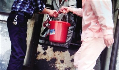 宰杀车间,一工人用桶接猪血,拿到血豆腐加工车间制作。