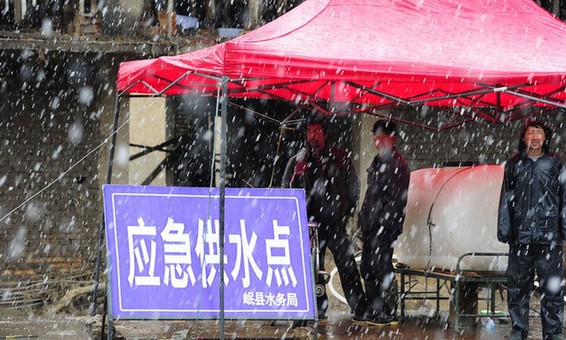 2012年5月13日,甘肃岷县,雹洪灾抢险第3天,安置点下起大雪。(岩石 摄)