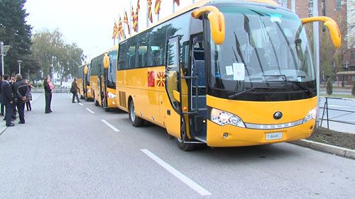 2011年11月25日,中国援助马其顿校车项目交接仪式在马总理府举行。中国政府代表驻马其顿大使崔志伟正式将援助校车交付马副总理阿里菲。图为崔大使(左)参观校车。