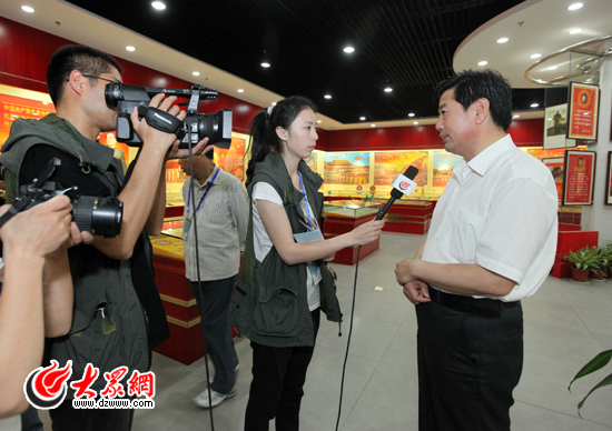 牡丹区区委书记刘传谨(右一)接受大众网记者韦辉(左一)、姜洋(左二)采访。(盛堃 摄影)