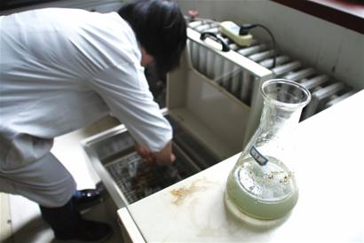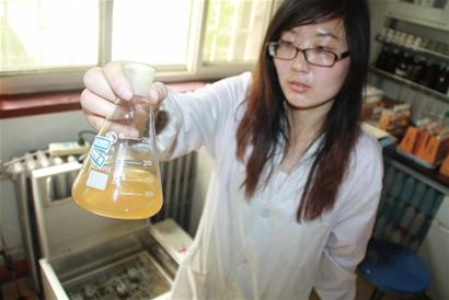 在微生物的“食物”准备好以后,神秘的“主角”终于登场了。李晶莹的实验助手从恒温振荡仪中取出了一个装有黄色液体的实验瓶,瓶中装有淡黄色的液体,而能够将铜从电子垃圾中析出的氧化亚铁硫杆菌就溶解在这液体中。实验人员将电子垃圾粉末装入实验瓶中,又将实验瓶放入恒温振荡仪中,随后氧化亚铁硫杆菌就开始了自己的工作,将金属中的铜慢慢析出。