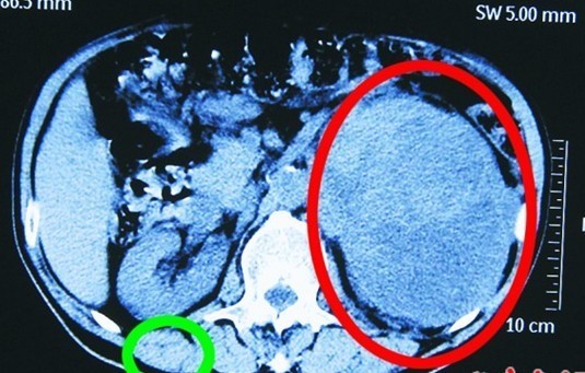 患者王先生的肾脏(图中绿圈处)和巨大肾肿瘤(图中红圈处)。