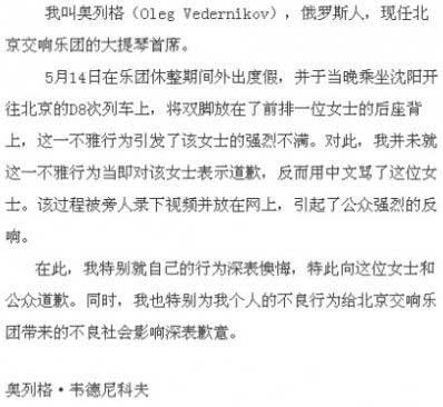 昨天下午5点,记者赶到北京交响乐团办公大楼,乐团工作人员首先向记者发送了已经在官网上公示的盖有北京交响乐团图章的《声明》,并付有奥列格用俄文亲笔写的《致公众和北京交响乐团的道歉信》的复印件和中译全文。