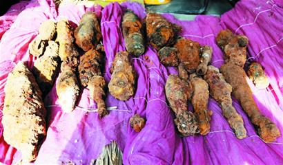 民警先用铁锨一点点将炮弹周围的泥土铲松,然后用手一把把地将泥土扒开,把炮弹轻轻挖出来。负责接应的民警找来厚厚的海绵垫,将挖出的炮弹放在垫子上。 “我发现有的炮弹还带着引信,有一定危险性,我们先大体看了看炮弹的样子,然后从上而下把它挖出来,尽可能少碰撞引信。 ”邱旭峰介绍,经过五名民警半个小时小心翼翼的挖掘,掩埋的炮弹全部被挖出,有23枚。茅寿昊告诉记者,之前他们辖区也曾挖出过炮弹,这一次挖出这么多的确有点惊人。