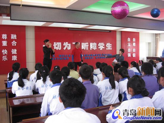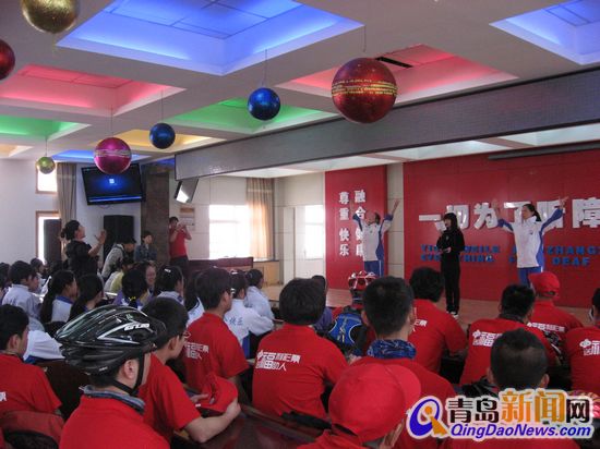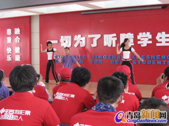 随后,在手语老师的指导下,青岛市中心聋校的孩子们也送上了排练已久的精彩节目,即手语朗诵及极富韵律感的舞蹈表演,演出博得在场各位的热烈掌声。最后,参与网友及随行人员还集体观看了青岛市中心聋校的宣传片,参观了校内随时可供学生阅读的“快乐书吧”及现代化教学器材交互式电子白板等硬件设施,全队对良好的校园环境感触颇深。