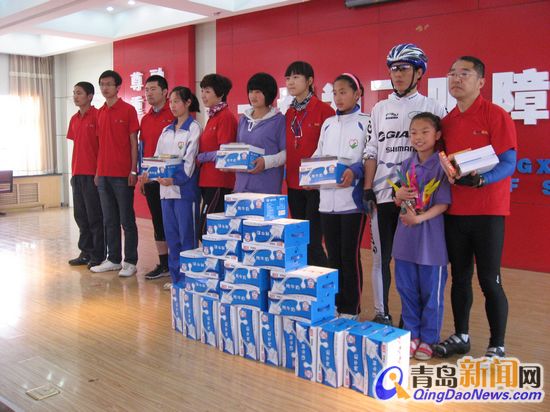 车行一小时,爱心骑行车队来到本次公益活动的目的地青岛市中心聋校,这里的老师与同学们早早佩戴好鲜艳的绶带,站在整洁的校园内等待着爱心人士们的到来。全队上下首先随校方来到会议室与学生们倾情互动,骑行网友送上了包括牛奶、记事本及其他活动用品在内的爱心礼物,网友代表上台发言,将他们汇集的希望与真情献给了这里的孩子们。爱心企业青岛光明乳业也赞助了几十箱爱心牛奶,送到了孩子们的手中。