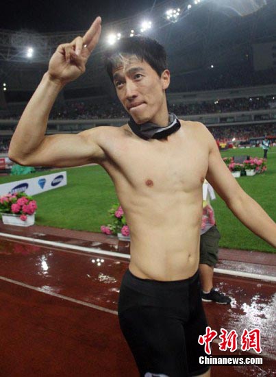刘翔在冲过重点显得十分兴奋,他撕掉了运动服