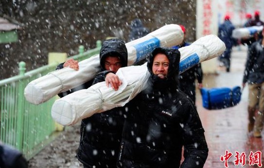 2012年5月13日,甘肃岷县,抢险救援工作仍在继续,安置点下起大雪