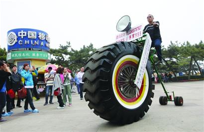 “栈桥附近有人在展示一辆超大的自行车,那个前轮比我的个子还高呢!”昨天下午,在栈桥附近游览的游客和市民都被栈桥广场西侧一辆巨大的自行车吸引。记者闻讯赶到栈桥西侧的观景广场,两名中年男子正轮流驾驶一辆超大型的自行车向过往的市民和游客展示。