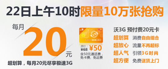 此次推出的20元卡之所以受到用户的强烈追捧,主要原因为该卡区别于以往复杂的资费方式,不再固定套餐内业务量,即不限制用来打电话还是用来发短信,或者是3G上网,且消费门槛也创新低,每月只需20元,本地拨打0.10元/分钟,国内上网流量0.0002元/KB,加之全球领先的3G网络优势,受广大用户的欢迎。17日首发10万张售罄后,用户纷纷通过微博、论坛、客服电话等方式强烈要求再次开放此款产品的销售。