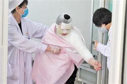 记者接到线索后赶到青岛君良烧伤医院时,医护人员正在为林某包扎烫伤的伤口,只见她的双臂、胸前都被缠上了厚厚的纱布,额头和脸颊也被纱布包裹,戴着网状固定套的她对于自己遭遇的意外很伤心。