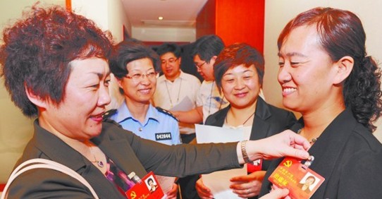 5月22日,出席省第十次党代会的烟台代表团代表报到后,兴高采烈地将出席证佩戴在胸前。(记者 汤序民 房贤刚 摄)