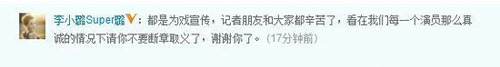 然而没想到在微博上随便的一句牢骚,却被李小璐看见并开始和该记者理论起来,“闹腾?我愿意谈?在人性和道德上我相信我问心无愧。我不需要可怜兮兮的为您所谓的通稿而低头,三岁拍戏到现在为的是我有信仰的家庭和观众以及善良懂事理的记者。but,I still feel grateful.Thanks a lot.”