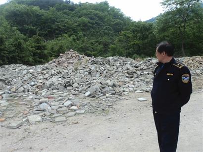 建筑垃圾怎能如此倾倒?记者随后将问题反映给了市浮山管理处,保卫科工作人员吴先生和两名市城管执法局的城管队员立刻赶到现场。 “这些都是山东头村拉过来堆放在这里的,这片山坡是村里的土地。”管理处工作人员经过调查后认为,即使这片土地属于山东头村,也不能随便将建筑垃圾倾倒在此。村里向工作人员解释,这些废砖烂瓦并不是要丢弃在这里,他们有时还会派卡车来运走一部分继续使用。