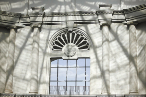 站在学校门外,一栋灰白色石材建筑进入记者视线。单从外观上看,该建筑就十分有气势。门窗全是紫红色实木,建筑顶部呈椭圆形,门前十根柱子支撑着门廊。