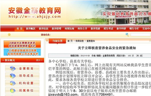 当晚,安徽金寨教育局亦在其官方网站发布《关于立即核查营养食品安全的紧急通知》。通知称,舆情出现后,省营养办,县委、县政府主要负责人作出指示,县学生营养改善计划领导组立即召开会议,县学生营养办连夜排查相关情况。