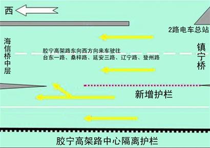 市北交警对胶宁高架路东向西方向作出的第二个调整是增加镇宁立交桥至海信立交桥之间的隔离护栏,此路段内的内侧车道为两车道。根据设置要求,此路段内高架路护栏以内的车辆只能在靠近海信立交桥位置的预留口驶出高架路,进入海信立交桥中层转盘,而原本在外侧车道的车辆不得驶入内侧车道,因此想要驶往台东一路、桑梓路、延安一路、辽宁路、登州路等方向的车辆必须提前变更车道做好准备。