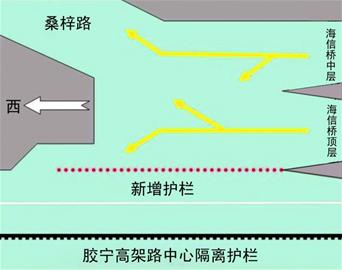 此外,市北交警在海信立交桥至桑梓路之间也将增加隔离护栏,而且此路段内,内车道的车辆不得驶出高架路,但外侧车道的车辆(从海信立交桥中层和顶层东向西方向)可以通过在桑梓路附近的预留口驶入高架路。“镇宁桥与海信桥、海信桥至桑梓路,两个路段分别只允许‘只出不进’和‘只进不出’,所以需要驾驶员根据自己的目的地情况提前做好行车路线,以免造成不便。