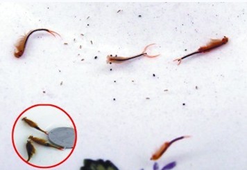 记者看到,这些神秘生物每只不到2厘米长,它们悠闲地在水缸里游来游去,身体中间部位有一条深褐色的黑线从头到尾贯通,其余部位则是晶莹剔透,两只黑色的眼睛突出地长在最前端,记者观察了1个多小时,发现这种生物只有腹部朝上“仰泳”的一种游泳方式,无论是前行还是掉头,它们都没有把身子反过来。