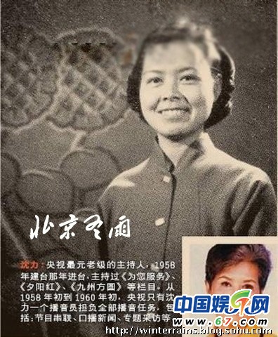 沈力是央视最元老级的主持人,央视1958年建台那年沈力进台,她主持过《为您服务》、《夕阳红》、《九州方圆》等栏目。从1958年初到1960年初,央视只有沈力一个播音员担负全部播音任务,包括:节目串联、口播新闻、专题采访等。