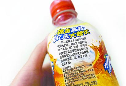 记者看到,娃哈哈冰红茶瓶身上写着:揭盖发现盖内刻有“再来一瓶”字样,即可凭中奖瓶盖就近选择娃哈哈饮料销售点或指定兑奖点免费兑换相同规格本品一瓶。