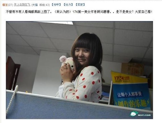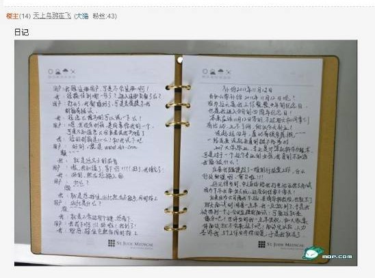 接着,该帖作者还特意强调,“对了,第一美女顾问是我说的,这不仅仅指美丽外表,更指美好内在。但是潘潘自己并不承认,她很谦虚,说自己在她们美女如云的部门里长得是倒数第一!具体我说的对还是她在谦虚,相信大家看了照片自有判断!”随后,“天上乌鸦在飞”发布了潘潘日记手写稿的照片以及文字内容,还有潘潘的一些生活照片。文字内容记录了潘潘在为读者、作者服务过程中所遇到的一些“囧事”和“趣事”,以及工作四年以来的职场酸甜苦辣。