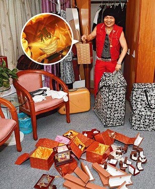 出名多金首饰的八两金,竟然从衣柜抽出两个大胶袋,里面放满一盒盒的金饰及金质摆设,他逐一拿出铺在地上。记者问他大约值多少钱,他说:“差不多值五、六十万!”