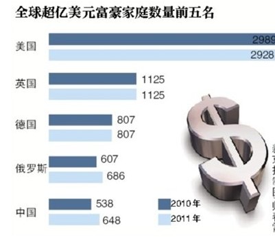 同时,中国财产超过一亿美元的超级富豪家庭比去年多了110户,增长20%。美国财经杂志《福布斯》评论称,“这一点很值得注意,2009年中国在超级富豪人数榜上还是第13位,没有一个国家实现过这样的跳跃。”