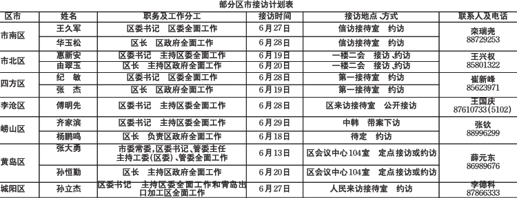 记者近日了解到,青岛12区市领导干部6月接访计划表出炉,市直重点单位领导干部接待群众来访安排也已敲定,本报选取6月份部分区市“一把手”接访的时间和地点安排予以刊登,有需求的市民可登录青岛政务网查询详情。