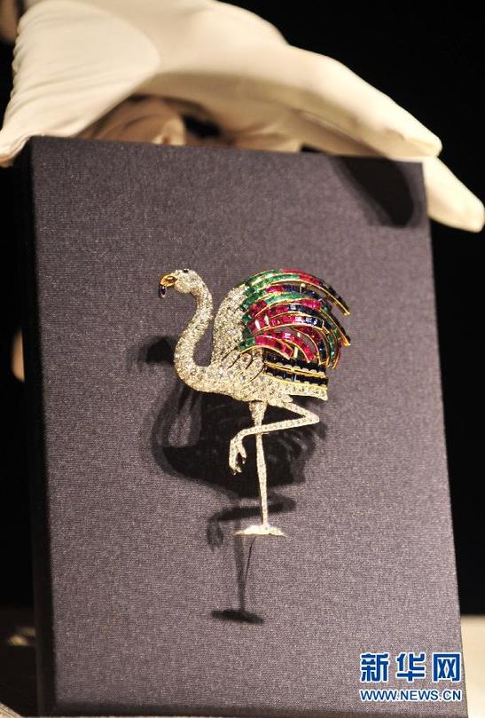 6月4日,工作人员在台北故宫博物院图书文献大楼开箱展示20世纪英国温莎公爵夫人佩戴过的“火鹤胸针”。