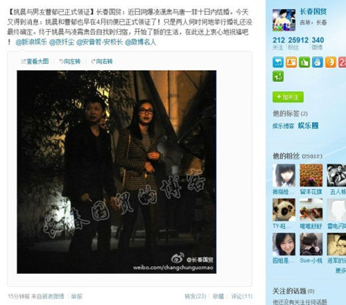 曝姚晨已与新男友曹郁领证 女方未辩白真假(组图)