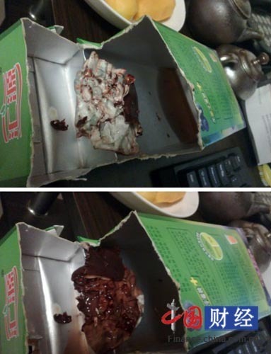 5月21日凌晨,网友“核桃小飞侠”发微薄称:“喝了一口,就在准备盖上翻盖的时候,我发现翻盖后面有些不对劲。为何如此脏,看看生产日期2011.12.23,应该没过期,之前看电视有报道过,包装盒里面有异物,难道我中奖了?”