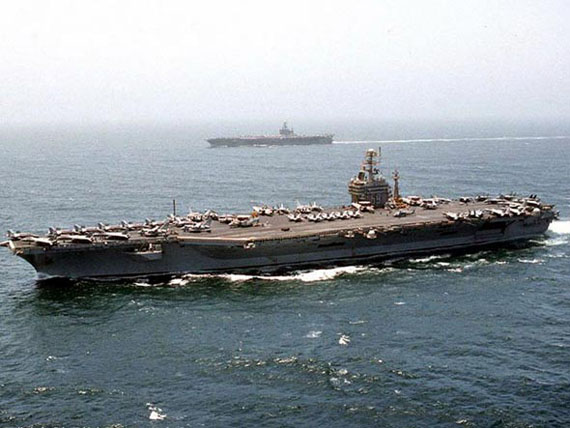 资料图:1月19日,美国航空母舰“林肯号”与已在阿拉伯海上的美国航母“卡尔 文森号”会师。