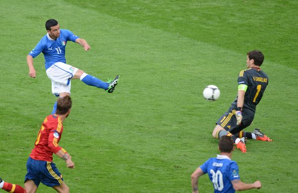 前45分钟,卡西利亚斯似乎是球场上更忙的人,尽管圣卡西高接低挡,但最后还是未能阻挡替补出场的迪纳塔莱在第60分钟帮助意大利队取得进球,虽然4分钟后法布雷加斯就将比分追平,但全场结束时1-1的结果意味着西班牙队在南非世界杯6连胜以及本届欧洲杯预选赛8连胜累积起来的大赛比赛14连胜记录就此止步了,也就是说西班牙队只能和法国队(2002-2004年)、荷兰队(2008-2010年)一起共享这一纪录。