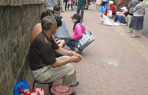 青岛市19中考场外,不少陪考的家长自带马扎