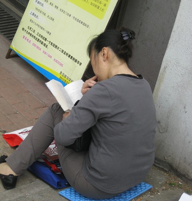 考场外,一位陪考家长在看书打发时间