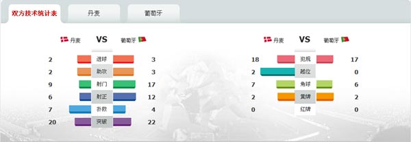 由于首轮输球葡萄牙队此役背水一战,而首战胜出的丹麦队则希望能够保持良好势头尽快确保晋级席位。此役是两队的第13次正赛交锋,之前葡萄牙队以7胜2平3负占据绝对优势,不过最近5战丹麦队明显有“扳回一城”的气势,以3胜1平1负稍占上风,其中在1996年欧洲杯决赛圈双方在小组赛中曾以1-1的比分握手言和。此役两队都维持了首战时完全一样的先发阵容,这意味着本特纳迎来了个人第50场国家队比赛。