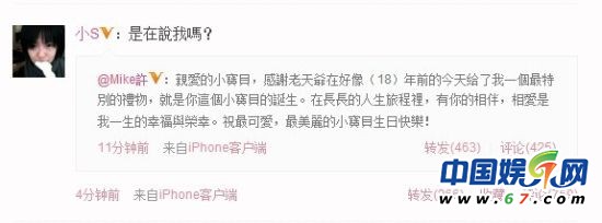 今天(6月14日)是小S的34岁生日,除了有朋友蜂拥而至的祝福外,老公许雅钧的祝福真是锦上添花,许雅钧在微博中极尽“肉麻”之能事,向小S示爱,祝福18岁、最可爱、最美丽的小宝贝生日快乐。