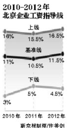 昨日,北京市人力社保局发布“2012年企业工资指导线”。其中,基准线定为11.5%。市人力社保局建议,生产经营正常、经济效益增长的企业,可参照该幅度安排本企业的工资增长水平。