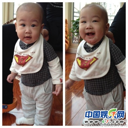 子龙今儿6个月了,长了3颗牙,爸爸在锻炼他做superman。