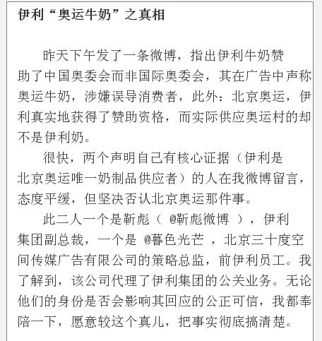 和讯网消息 6月13日,认证微博作家关军撰写《伊利“奥运牛奶”之真相》,指出在北京奥运之前的检测中,伊利的产品未达到奥运标准,但因为伊利为北京奥运赞助商,根据协议,在奥运权益上具有排他性,于是供应奥运会运动员的奶制品换为三元,不过仍使用伊利的包装。