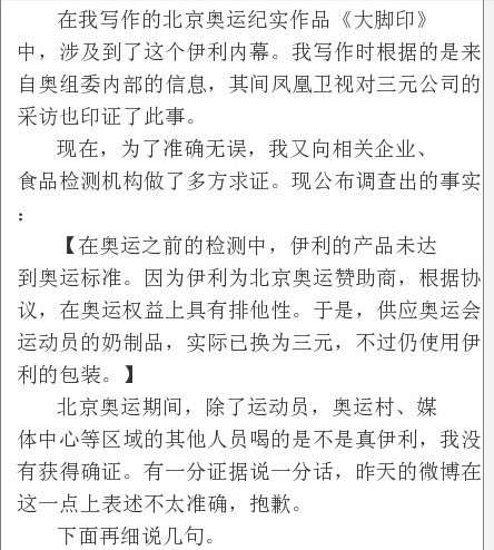 “奥运食品检测极其严苛,很多项目是一般食品企业平素不会自检的,所以我不觉得奥运末达标就能说明伊利乳品质量多么不堪,但是,伊利方面否认这一事实,并一直以‘奥运牛奶’、‘奥运品质’误导消费音,必须澄清事实,郑重致歉。”关军说。