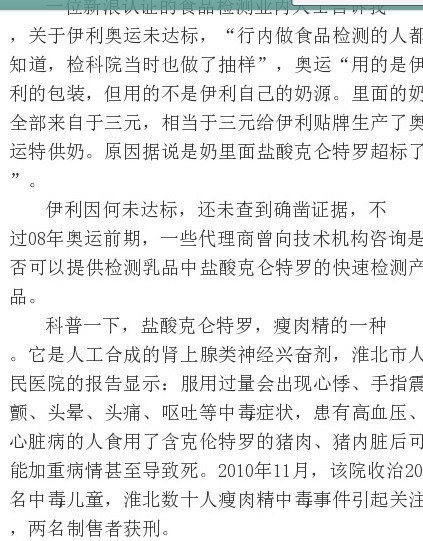 关军坦陈,伊利因何未达标,还未查到确凿证据,不过08年奥运前期,一些代理商曾同技术机构咨询是否可以提供检测乳品中盐酸克仑特罗的快速检测产品。
