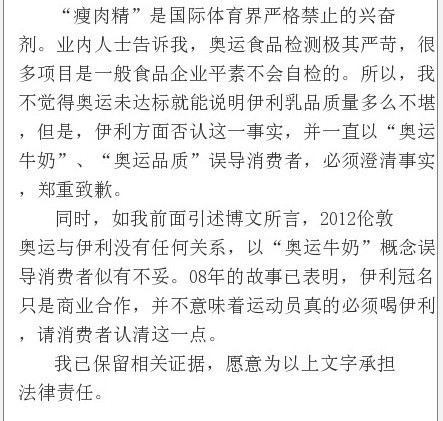 关军强调,2012伦敦奥运与伊利没有任何关系,“奥运牛奶”是在误导消费者,冠名只是商业合作,并不意味着运动员真的必须喝伊利。“我已保留相关证据,愿意为以上文字承担法律责任。”