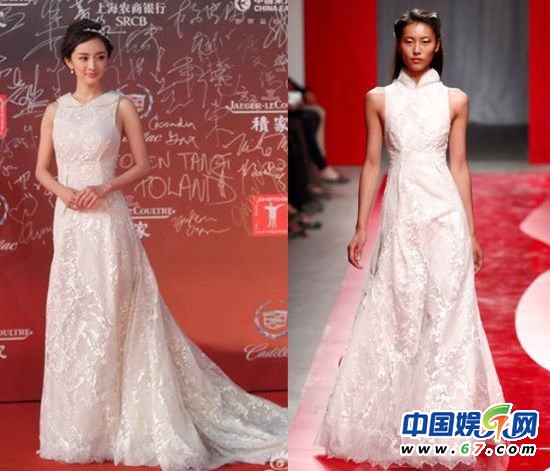 如此中国风十足的礼服来自Shiatzy Chen 2012春夏系列,秀场上是有中国超模刘雯压轴演绎。相比刘雯的随意长发,杨幂精心点缀的皇冠装饰不但没有加分,反而被网友戏称为“乡土”新娘。