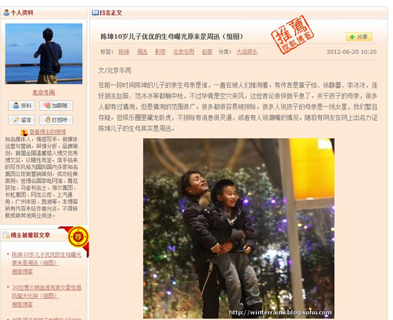 网曝陈坤儿子生母为一线女星 网友猜测疑Z姓女星(图)