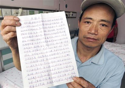 这段时间,来自社会各界的爱心一直包围着赵祥海这个五口之家,当听到妻子于曰芳开口说话的消息后,赵祥海回想起妻子患病后感人的一幕幕场景,含着热泪写下了3页感谢信。记者将其中部分摘录下来:
